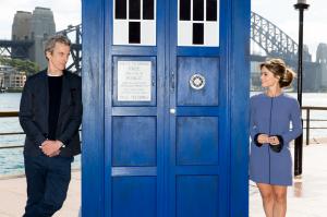 Then it was time for Peter and Jenna to head out for the photo shoot. The TARDIS had been moved outside, and with the Harbour Bridge as a backdrop, Peter and Jenna posed for a tight and demanding group of photographers, a mix of professional paparazzi and amateur snappers. They were of course accommodating and graceful, responding to calls to turn this way or that, to go inside the TARDIS, outside the TARDIS, you get the idea. And of course, the commotion attracted a lot of passers-by and tourists all wondering what was going on. Some recognised Peter and the TARDIS; others had no idea. But the iPhones and cameras clicked away.