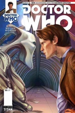 I continue to enjoy the efforts of artist Boo Cook, with him providing a style of artwork that engages and fits in perfectly with the sterile and detached future setting. A fine line is trod between a believable world and a slightly 'out-there' dimension, and this evokes quite well the very distinct style that the Matt Smith/ Steven Moffat stories constituted. The expressions of Jones and indeed Alice to some degree are what one would expect of people who do not belong to this corner of space. in a chapter of history yet to happen from their points of view. Also praiseworthy is how Cook’s artwork becomes more literal and realistic to emphasise fierce emotions - especially when it comes to the distinctive face of the Doctor.