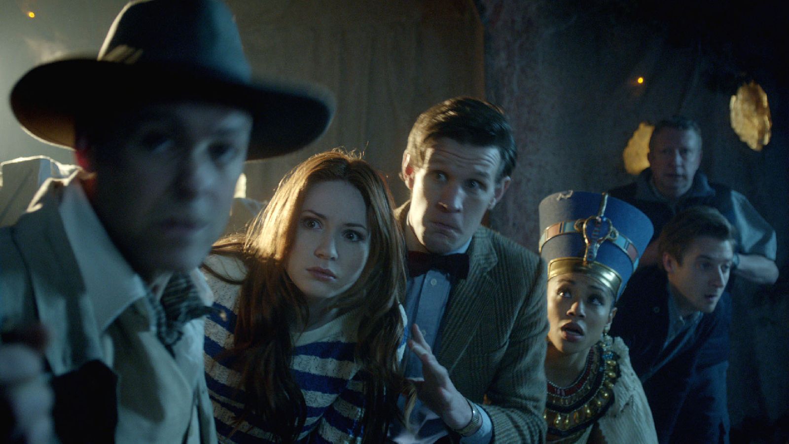 This may read as a criticism but it is not, with an episode this bonkers you need an appropriately bonkers start to hurl you straight in, the madness reflects the chaos that is The Doctor and the whirlwind that is his existence, but anyway on with the episode as The Doctor assembles a motley crew of an Egyptian queen, a big game hunter and the Ponds plus Dad to save a ship full of dinosaurs from being blown up by the Indian Space Agency. This is most definitely a story aimed at the family audience rather than "The Fans" but is that really a bad thing? It's hard to be cross with an episode that is just this much fun, the humour doesn't always hit, some of the 'Carry On' style jokes will have you groaning but the more subtle joking raised a laugh from me, in particular the lovely touches of the ship being powered by waves from an internal beach and the tantrum throwing useless robots, beautifully voiced by comedy duo Robert Webb and David Mitchell.