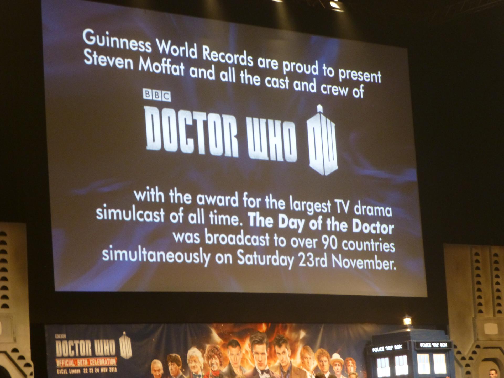 For something originally billed as three iterations of essentially the same thing, it wasn’t only the line-up of guest talks, screening commentaries and features that shifted every day. Each day also had a distinct feel to it: different moments, same venue. Day 1 was largely about organisers finding their feet, and realizing what didn’t work and what needed tweaking, leaving guests almost treated as guinea pigs ahead of the actual anniversary date. Saturday hosted the Graham Norton Show, and had fans commemorating the anniversary instant at 5:16pm. By this time things were running more smoothly. However, on Sunday there was a sense of some merchandise stock running out and last-minute scheduling taking hold (“check at the Event Information/Meeting Point”), but most people were in a post-Special haze and were ecstatic to be there for the Guinness world record announcement at the end of the Eleventh Hour panel.